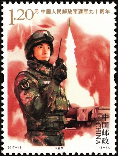 2017年8月1日中國郵政發(fā)行了2017-18《中國人民解放軍建軍九十周年》紀念郵票1套6枚,小型張1枚。圖案內容分別為:陸軍、海軍、空軍、火箭軍、戰(zhàn)略支援部隊、武裝警察部隊,小型張內容為聽黨指揮。該套郵票展現了中國人民解放軍的颯爽英姿和中國軍事作戰(zhàn)裝備的硬件實力,主題鮮明,磅礴大氣,畫面具有強烈的動感和威嚴的氣勢。小型張上軍旗飄揚,各軍種英姿颯爽,背景襯托各軍種高尖端裝備,描繪了我軍戰(zhàn)士聯合作戰(zhàn)的畫面,既表現了中國人民解放軍威武雄壯的軍容和現代化水平,也體現出黨的十八大以來,人民軍隊在新時代強軍目標指引下所取得的巨大成就。