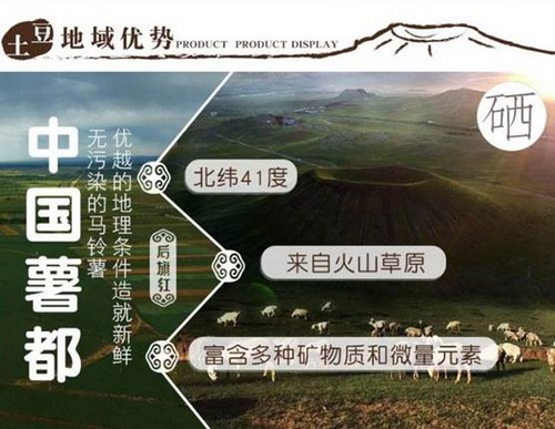 在這里種植土豆比起其他地區(qū)有著獨特的土壤優(yōu)勢,因為這里位于內(nèi)蒙古自治區(qū)的火山地質(zhì)公園—烏蘭哈達火山群,覆蓋著馬鈴薯優(yōu)勢區(qū),在這里盛產(chǎn)的馬鈴薯有“皮紅、內(nèi)黃、質(zhì)綿口香”的特點,被人們譽為“火山滋養(yǎng)的綠色食品”。