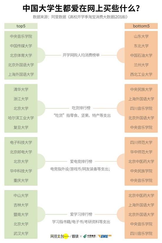 根據(jù)往年的數(shù)據(jù),大學(xué)開學(xué)季,中國高校大學(xué)生網(wǎng)購消費,往往會達到一個小高峰。阿里數(shù)據(jù)則顯示,開學(xué)網(wǎng)購人均消費高校榜單中,中央音樂學(xué)院、中國傳媒大學(xué)、北京體育大學(xué),以最高的人均消費排名前三。