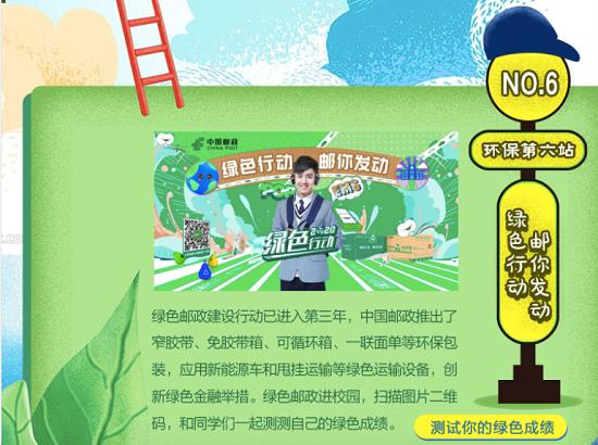 加油第六站,中國郵政倡導(dǎo)和大家一起實行綠色郵政,共創(chuàng)綠色家園。在推廣綠色郵政的三年中,中國郵政圍繞21項環(huán)保指標(biāo),不斷升級,比如提供窄膠帶、免膠箱,使用環(huán)保材料,進行環(huán)保投遞,綠郵行動,郵你發(fā)動,快來一起測測你的綠色成績!
