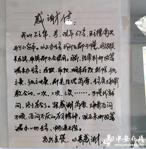 9月22日一大早,郵儲銀行亳州市立德鎮(zhèn)支行剛剛營業(yè),一位老大爺匆匆走進(jìn)網(wǎng)點大廳,對工作人員說:“你們負(fù)責(zé)人在嗎?”還沒等工作人員回話,老大爺接著說:“我是來送感謝信的,感謝你們工作人員不厭其煩的教會我辦理各項業(yè)務(wù)?!边呎f老人邊從口袋里掏出一封手寫的感謝信。