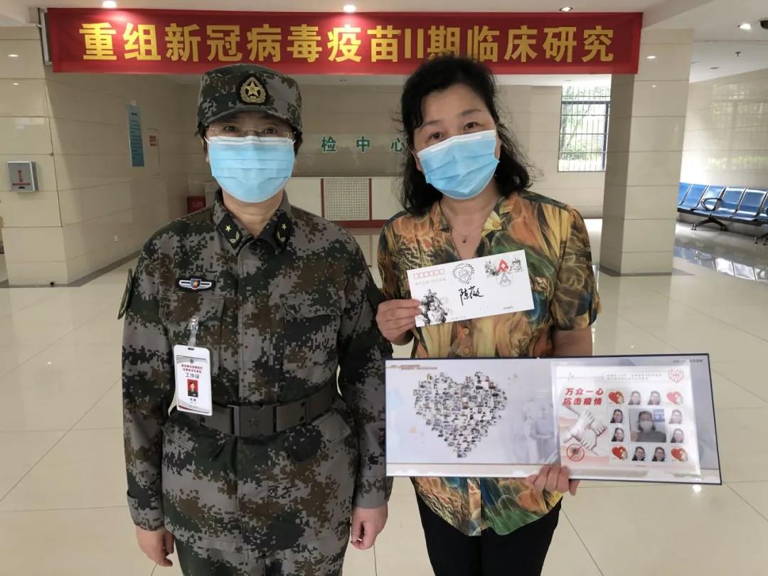 在為期6個(gè)月的觀察期里,胡巧云經(jīng)歷了多次定期“回訪檢查”,身體狀況一直健康良好,其間沒有出現(xiàn)任何不適。胡巧云在9月27日又做出人生的“重大決定”,再次接種疫苗。這次她參與的是重組新冠疫苗(腺狀病毒載體)I期加強(qiáng)免疫臨床試驗(yàn),試驗(yàn)觀察期為一年。9月28日,胡巧云接受了本輪觀察期的首次抽血檢查,檢查中,她又見到了熟悉的陳薇院士,遞上專程帶來(lái)的郵資紀(jì)念封請(qǐng)她簽名并合影留念。