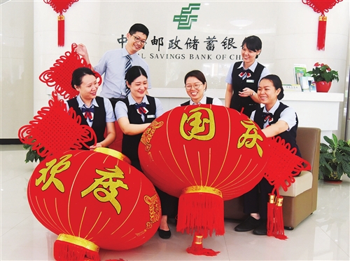 為慶祝新中國(guó)成立71周年、歡度中秋佳節(jié),郵儲(chǔ)銀行海南省分行直屬支行員工利用工作之余,買來(lái)燈籠、編制中國(guó)結(jié),積極營(yíng)造節(jié)日氛圍,為爭(zhēng)創(chuàng)中國(guó)銀行業(yè)“千家示范網(wǎng)點(diǎn)”再添一把火。