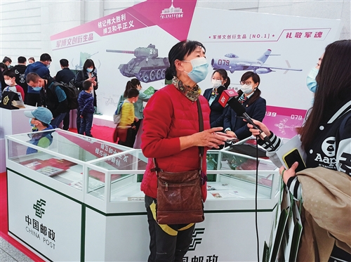 圖為北京郵政在中國(guó)人民革命軍事博物館設(shè)立的臨時(shí)郵局內(nèi),郵迷們積極選購(gòu)郵品并接受媒體采訪(fǎng)。
