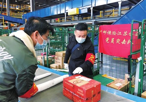 圖為中郵保險江蘇分公司黨員突擊隊忙碌在郵件裝運現(xiàn)場。