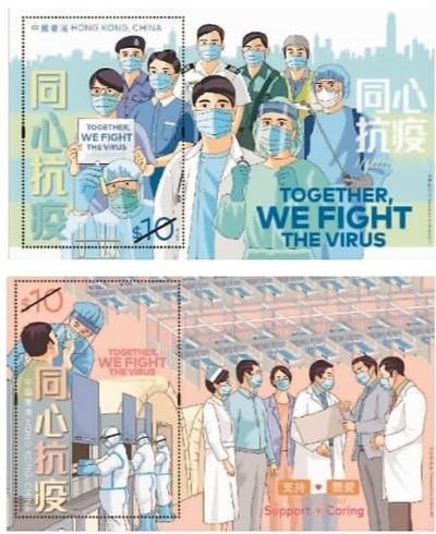香港郵政15日公布,將于本月29日發(fā)行主題為“同心抗疫”的特別郵票及相關(guān)郵品,以表揚社會各界的抗疫英雄,并感謝中央政府對香港抗疫工作給予的全力支持。此次發(fā)行的郵票小型張共有2款,各嵌有一枚10港元的特別郵票。其中一款描繪一群與香港市民并肩作戰(zhàn)、致力維持緊急服務(wù)的抗疫英雄,另一款郵票小型張則以不同場景呈現(xiàn)中央政府對香港的關(guān)愛和重視。
