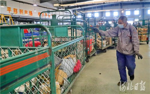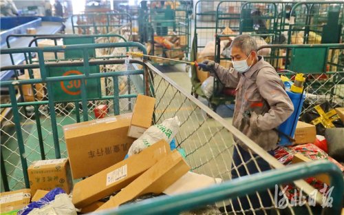 2021年1月7日,位于河北省秦皇島市海港區(qū)臨港物流園區(qū)的中國郵政集團(tuán)有限公司秦皇島市分公司網(wǎng)路運(yùn)營中心內(nèi),工作人員在對(duì)快遞包裹進(jìn)行消殺。