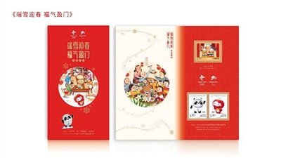《瑞雪迎春 福氣盈門》拜年封卡折套裝是為慶祝北京2022年冬奧會倒計時一周年,同時迎接2021年春節(jié)而打造的一款年貨,由一枚貼有辛丑年生肖郵票的拜年紀念封和插有拜年郵票與吉祥物郵票的郵折組成。郵折封面大紅色基調,由雪花、大門、全家福組成;郵折內含有《北京2022年冬奧會吉祥物和冬殘奧會吉祥物》郵票一套2枚,《拜年》郵票一套1枚。紀念封卡折套裝可作為新年賀卡,通過郵寄的傳統(tǒng)方式向遠方的親友送去問候;還可插放壓歲錢,作為新年紅包傳遞祝福。