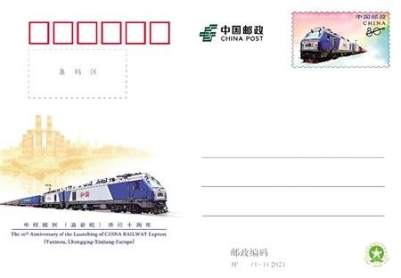 3月19日,中國(guó)郵政將發(fā)行今年首套紀(jì)念郵資片——JP259《中歐班列(渝新歐)開行十周年》紀(jì)念郵資明信片,全套一枚,面值80分,預(yù)計(jì)郵局售價(jià)1.20元。