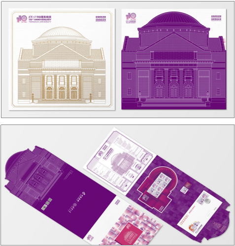 該套郵票特邀清華美術學院陳楠教授團隊設計,主票畫面以“清華紫”結合豐富的變化層次為畫面主基調,采用插畫形式表現(xiàn)了清華大學最具辨識度的校園歷史景觀——二校門,突出了校門的厚重感和歷史感,背景淡雅多姿的花朵為象征團隊精神的清華大學?;ā锨G花,飛舞的花瓣象征了勤奮學習的莘莘學子和默默耕耘的辛勤園丁。附票畫面以清華大學110年校慶專用標志為畫面主體,結合標志的網(wǎng)格制圖原理,并搭配燙金設計效果,形成理性、現(xiàn)代的設計風格,整體畫面積極向上、自由活潑,凸顯出校慶的熱烈氛圍。