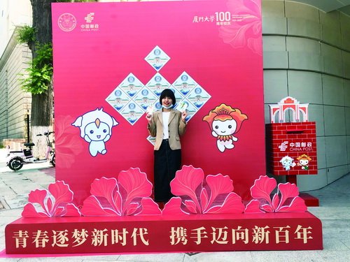 為獻禮廈大百年華誕,中國郵政集團特別為廈門大學校園主題郵局開通了廈門大學百年校慶專題個人定制郵票服務,校友和師生掃描中國郵政“微郵筒”二維碼進入郵票DIY界面,就可讓自己的照片登上郵票,將個人與廈門大學百年華誕珍貴瞬間一起定格,永遠珍藏。該服務支持線上、線下定制,在主題郵局網(wǎng)點內(nèi)可立等可取。目前有“我在廈大等你”和“鳳凰花開 青春綻放”兩種版式可選。