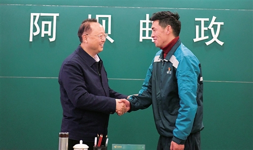 四川省分公司黨委書(shū)記、總經(jīng)理廖濤(左)深入阿壩郵政調(diào)研時(shí)看望哈弄奪機(jī)。