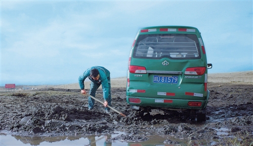 夏天,暴雨突驟,坑坑洼洼的土路變成了連成片的水坑,車(chē)輛根本沒(méi)法擇路而行,郵車(chē)很容易陷進(jìn)泥潭,沒(méi)有工具,只能用手刨石墊土;冬天,白雪皚皚,在送郵件的途中,郵車(chē)時(shí)常會(huì)陷進(jìn)厚厚的積雪中,在渺無(wú)人煙的茫茫草原上,他用雙手將厚厚的積雪從車(chē)下刨出,才能將車(chē)從雪地里開(kāi)出來(lái)?!白顮€的一段路全是坑,5公里的路要開(kāi)一個(gè)多小時(shí)才開(kāi)得過(guò)去,比走路還慢?!惫獖Z機(jī)說(shuō),那條600公里的郵路,正常情況跑下來(lái)需要12個(gè)小時(shí)左右,路上不順的話,要十六七個(gè)小時(shí)。