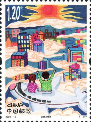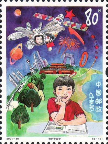 登上《兒童畫作品選》特種郵票的3幅作品“我的中國夢”“國粹之韻”和“希望與夢想”,分別由上海市同濟小學的楊曉芒、合肥新站壽春實驗中學的費玉婷、上海市周浦第三小學的錢昕逸3位小朋友設計。第一枚通過描繪我國航空航天事業(yè)、城市、交通網(wǎng)絡繁榮發(fā)展等場景,表達了少年兒童不斷追尋探索宇宙的夢想以及對未來美好生活的憧憬;第二枚描繪了傳統(tǒng)文化與城市發(fā)展、現(xiàn)代科技共繁榮的場景,表達了少年兒童對中華優(yōu)秀文化的熱愛與傳承;第三枚描繪了偉大祖國不斷發(fā)展的場景,少年兒童登高望遠、憧憬未來。三枚郵票緊密圍繞主題,展現(xiàn)出少年兒童對黨領導下的偉大祖國的無比熱愛、由衷禮贊和美好祝愿。
