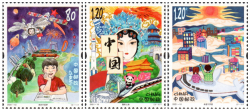 《兒童畫(huà)作品選》特種郵票一套3枚,分別為《我的中國(guó)夢(mèng)》《國(guó)粹之韻》《希望與夢(mèng)想》?!段业闹袊?guó)夢(mèng)》通過(guò)描繪我國(guó)航空航天事業(yè)、城市、交通網(wǎng)絡(luò)繁榮發(fā)展等場(chǎng)景,表達(dá)了少年兒童不斷追尋對(duì)宇宙探索的夢(mèng)想以及對(duì)未來(lái)美好生活的想象與憧憬;《國(guó)粹之韻》描繪了傳統(tǒng)文化與城市發(fā)展、現(xiàn)代科技共繁榮的場(chǎng)景,表達(dá)了新時(shí)代的少年兒童對(duì)中華優(yōu)秀傳統(tǒng)文化的追求和傳承;《希望與夢(mèng)想》描繪了偉大祖國(guó)不斷發(fā)展的場(chǎng)景,少年兒童登高望遠(yuǎn)、憧憬未來(lái)。三枚郵票緊密?chē)@主題,展現(xiàn)出少年兒童對(duì)黨的領(lǐng)導(dǎo)下偉大祖國(guó)的美好祝愿、熱愛(ài)和自豪。其中,《國(guó)粹之韻》由合肥新站壽春實(shí)驗(yàn)中學(xué)的費(fèi)玉婷同學(xué)設(shè)計(jì)。