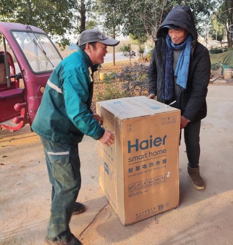 熊桂林為燎原村陳屋基灣村民陳志強老人送去網(wǎng)購的熱水器。