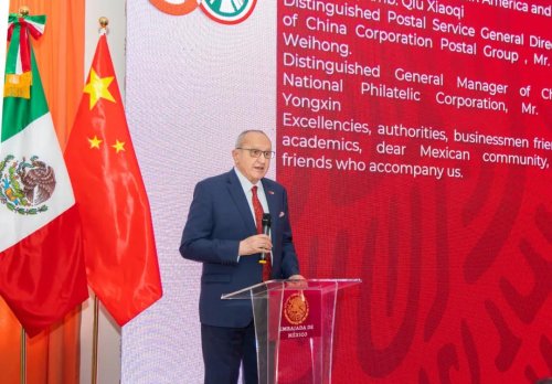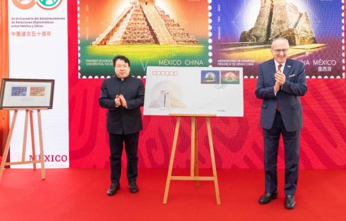 為慶祝中國與墨西哥建交五十周年,墨西哥駐中國大使館于2月14日舉辦了隆重的紀念儀式,并同時舉行該主題郵票首發(fā)式。墨西哥駐華大使施雅德、中國政府拉美事務特別代表邱小琪、中國郵政集團有限公司相關負責人出席活動。