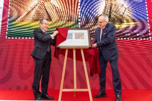 儀式上,雙方共同為《中墨建交五十周年》紀念郵票和首日封揭幕,并互贈郵票主題紀念品。