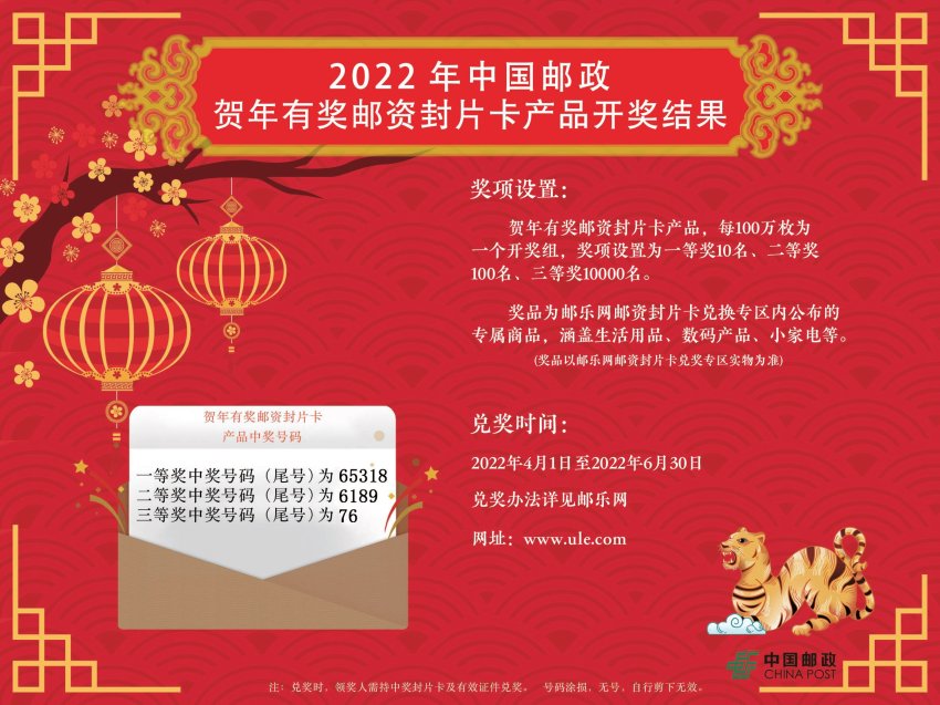 中獎號碼于2022年3月18 日在中國郵政官方網(wǎng)站、微信公眾號發(fā)布,并刊登在2022年3月22日的《中國郵政報》上。請各?。ㄗ灾螀^(qū)、直轄市)郵政分公司及時將相關(guān)信息告知社會公眾。