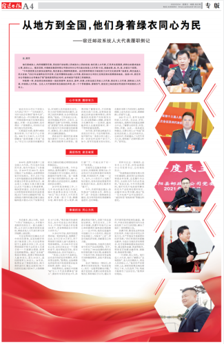 和殷勇一樣,來自宿遷郵政基層一線的吳愛軍、張良志、袁軍、洪瀟,分別當(dāng)選江蘇省人大代表、宿遷市人大代表、泗陽縣人大代表、中揚(yáng)鎮(zhèn)人大代表。五名人大代表傾聽來自基層的聲音,把一個個帶著露珠、冒著熱氣、散發(fā)泥土味的建議傳遞到不同層面的人代會上。