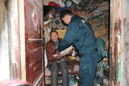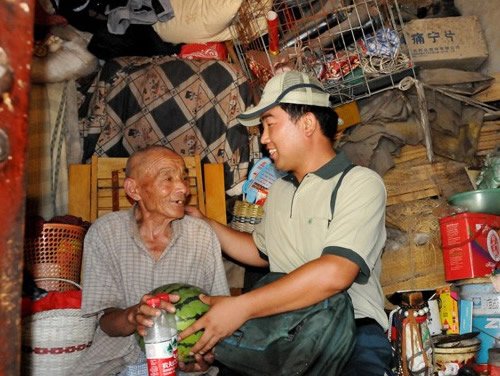 在訂戶眼中,張軍是個有名的“熱心腸”。在他負責的片區(qū)里,有一位早年喪偶的孤寡老人——邰連科,老人已經70余歲,靠低保和撿破爛為生,雖然他不是張軍的報刊訂戶,但是看到老人孤獨的身影,一種憐憫之心油然而生。于是他就成了老人的“義務志愿者”,每天路過老人家門口,他都要停下匆匆的腳步,看一看老人的生活狀況,還自掏腰包為老人買點水果,帶點米面。每次提起張軍,老人都感動地說:“我沒有兒子,上天卻為我?guī)硪晃挥H人?!边@件事,張軍已經做了2年,他用自己的愛心鋪就了一條特殊的郵路。