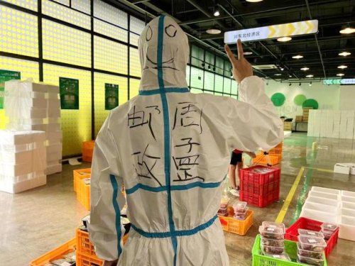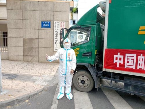 成都市郵政分公司相關(guān)負責(zé)人介紹,為了保證運輸生活物資能快速、新鮮、安全地到達管控區(qū)的居民手里,“郵遞小哥”每天穿著防護服至少14個小時,常常忙到深夜,第二天又奔赴在抗疫一線。