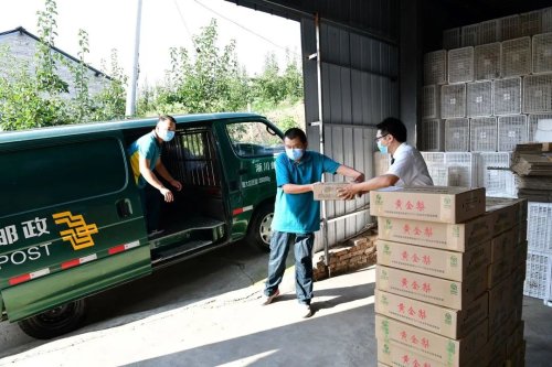 “大家都辛苦了,先歇歇,吃個(gè)果子再搬也不遲。”不遠(yuǎn)處,身著“郵政綠”的工作人員正揮汗如雨,幫果農(nóng)把金燦燦的富硒梨裝箱上車。