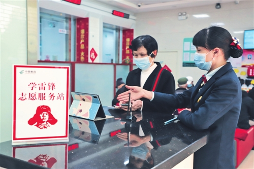 為擦亮“學(xué)雷鋒”志愿服務(wù)品牌,貴港市70個(gè)郵政金融網(wǎng)點(diǎn)目前都設(shè)立了志愿服務(wù)站,自覺(jué)為客戶提供更加優(yōu)質(zhì)的服務(wù),進(jìn)一步提升服務(wù)滿意度。圖為該分公司和平路網(wǎng)點(diǎn)員工向客戶講解金融知識(shí)。