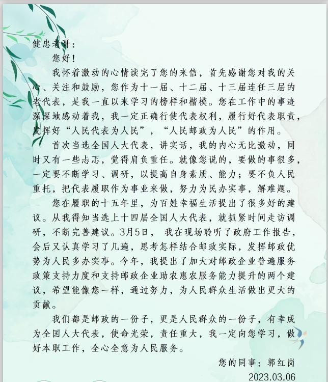 “人民代表人民選,我當(dāng)代表為人民;人民郵政為人民,干好本職為人民?!焙谓≈蚁M@兩封信能如同接力棒,將郵政人的為民情懷、人民代表的職責(zé)使命傳遞下去。