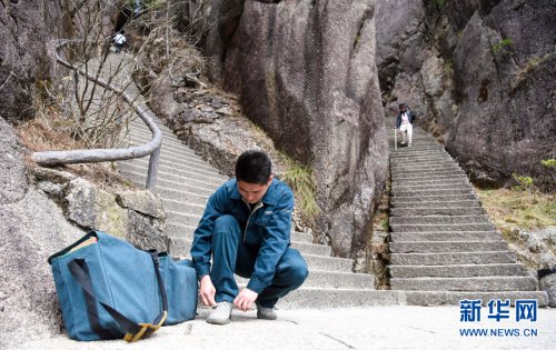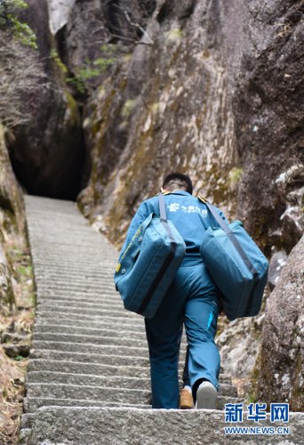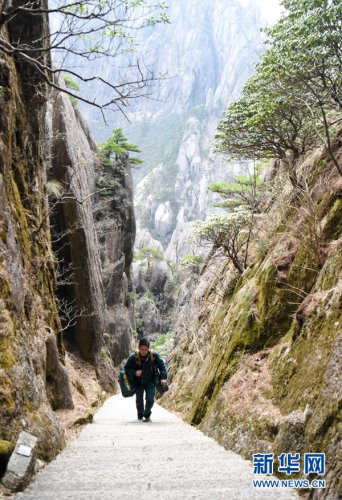 黃山素有“三十六大峰,三十六小峰”之稱,主峰蓮花峰海拔高達1864.8米。風(fēng)景區(qū)內(nèi),山路崎嶇、不通車馬,山上工作人員和游客所需的報刊、信件等,只能靠謝菲俊背著郵包送上山。