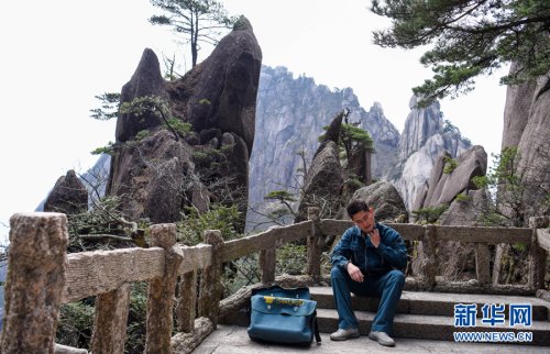 3月16日,休息間隙,謝菲俊放下郵包,一邊擦汗一邊欣賞黃山美景。
