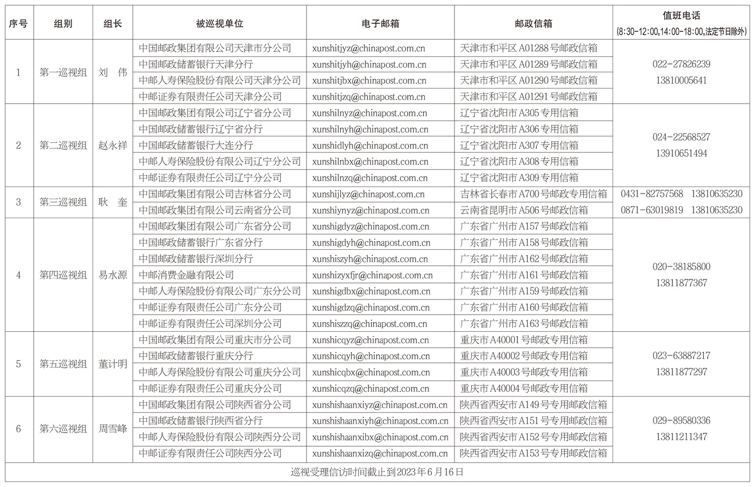 中國(guó)郵政集團(tuán)有限公司黨組2023年第一批巡視進(jìn)駐一覽表