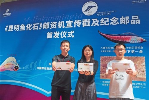 “5·18”國(guó)際博物館日當(dāng)天,《昆明魚(yú)化石》郵資機(jī)宣傳戳及系列紀(jì)念郵品首發(fā)儀式在西北大學(xué)博物館舉行。此次發(fā)行的《昆明魚(yú)化石》郵資機(jī)宣傳戳及明信片、信封一套,郵資機(jī)宣傳戳以昆明魚(yú)化石及昆明魚(yú)復(fù)原圖為主圖,明信片以寒武紀(jì)早期生態(tài)復(fù)原圖為畫(huà)面進(jìn)行設(shè)計(jì),信封用手繪圖的方式展示昆明魚(yú)與“西大動(dòng)物”的形象區(qū)別,并展現(xiàn)生物從魚(yú)到人的進(jìn)化過(guò)程。