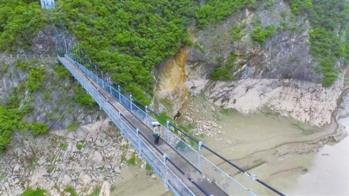 羅運(yùn)良背負(fù)郵件,步行在建陽(yáng)坪村利方巖橋上。
