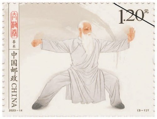 該套郵票一套3枚,圖案內(nèi)容分別為拳術(shù)、器械、推手。郵票采用工筆人物形式表現(xiàn),整體色調(diào)以黑白灰為主,背景采用水墨飛白映襯太極拳平和、包容、大道至簡的意境。第一枚郵票表現(xiàn)了一位白發(fā)長須老者,正氣定神閑地做著太極拳單鞭動作,體現(xiàn)出太極拳的傳統(tǒng)風范和延年益壽的作用。背景用揮灑自如的水墨筆觸和肌理來表現(xiàn),伴隨老者動作產(chǎn)生無形氣韻。第二枚郵票中是一位英姿颯爽的舞劍女子,背景中如影隨形的氣流若隱若現(xiàn),體現(xiàn)出太極劍行云流水的特點。第三枚郵票中是一對進行太極拳推手的男女青年,一男一女、一黑一白象征太極的陰陽相濟,背后的水墨肌理隱約形成陰陽的概念,刻畫出“陰陽太極本相隨、動靜虛實把手推”的場景。