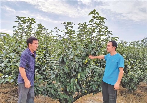 丁丹偉(右)在了解果樹長勢(shì)時(shí)與農(nóng)戶交談。
