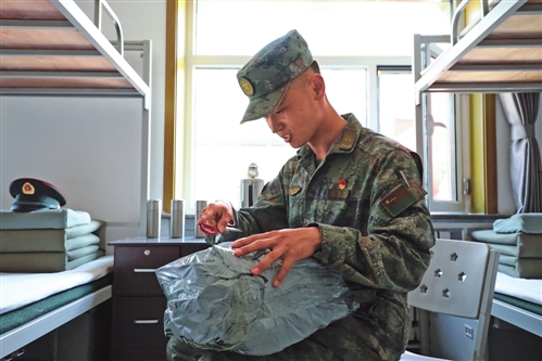 7月25日下午,在位于內蒙古自治區(qū)阿爾山市大興安嶺深處的三角山邊防連,記者與戰(zhàn)士張岳麟一起,從營區(qū)門口的郵政驛站取回了令他期待不已的家鄉(xiāng)包裹?!笆羌依锛膩淼牧闶澈蛶准褚路??!辈鸢鼤r,張岳麟的笑容感染了在場的所有人。