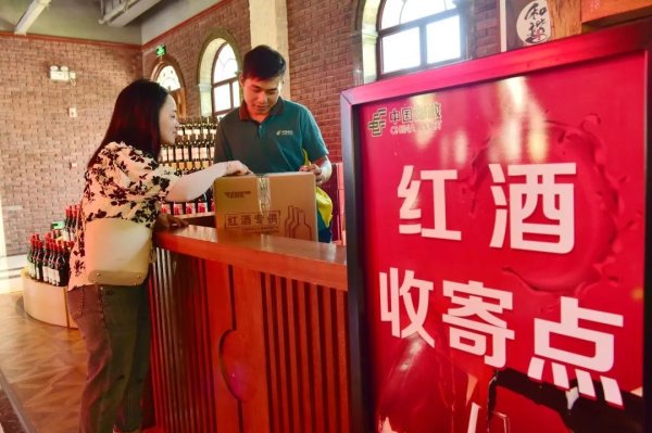 在昊苑村格莉琪酒莊的紅酒收寄點,西夏區(qū)郵政分公司火車站攬投部的葉萬文駐點為參觀酒莊的游客提供紅酒打包寄遞服務。