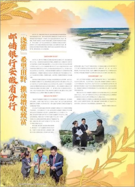 郵儲銀行安徽省分行將繼續(xù)立足安徽省情農(nóng)情,圍繞現(xiàn)代農(nóng)業(yè)發(fā)展新特點新要求,主動切入重要項目和重大工程,創(chuàng)新金融產(chǎn)品和服務(wù)模式,為“農(nóng)業(yè)有干頭、農(nóng)村有看頭、農(nóng)民有奔頭”的壯美畫卷添上濃墨重彩的一筆。(數(shù)據(jù)來源:郵儲銀行安徽省分行)