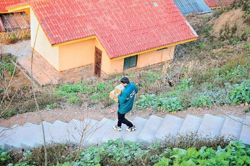 郵政小哥穿梭在蜿蜒的聯(lián)戶路上投遞包裹。 □吳敏 攝