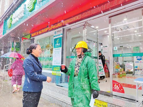 1月22日,我國南方大范圍降雪。江西省鷹潭市余江區(qū)郵政分公司金融網(wǎng)點的工作人員一早就支起“茶攤”,為戶外勞動者和來往群眾送上熱氣騰騰的姜茶。