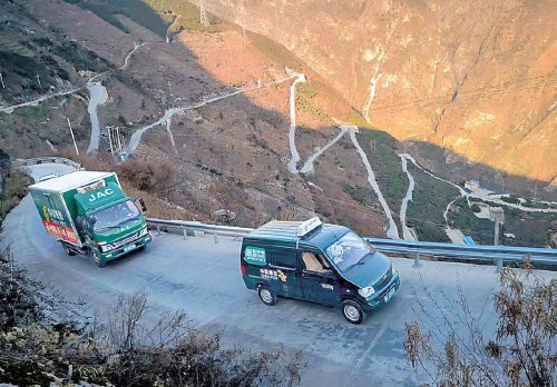 從四川省甘孜藏族自治州康定市出發(fā),沿著318國道向西行駛30多公里就到達大渡河邊。從河谷沿著一條崎嶇山路上行,此時,導航軟件傳來急促的提醒:“前方連續(xù)急轉(zhuǎn)彎,請小心駕駛!”抬頭一看,眼前的盤山郵路如一條揮舞的絲帶,曲折回環(huán),不禁讓人膽寒。