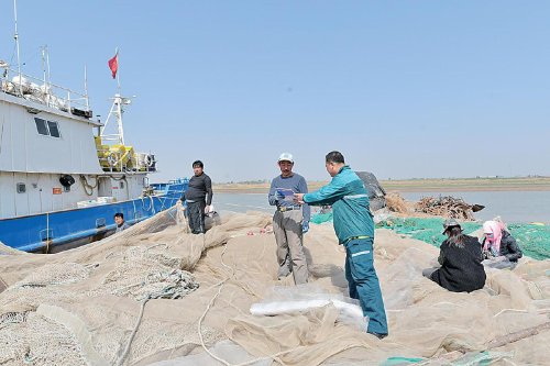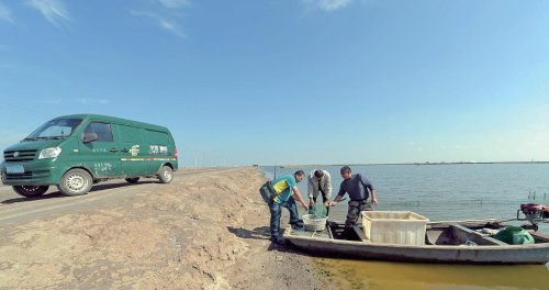 無(wú)棣埕口郵政支局投遞員王海進(jìn)在投遞途中幫客戶倒網(wǎng)收蝦。