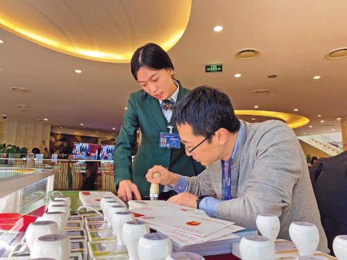 李曉爽是梅地亞中心臨時郵局的營業(yè)員。今年,梅地亞中心臨時郵局為兩會駐地新聞記者提供了種類豐富的郵品。李曉爽提前準(zhǔn)備,認(rèn)真了解各類郵品的特點,力求在服務(wù)上精益求精。她說:“兩會服務(wù)讓我在政治意識、服務(wù)意識和營銷能力等方面得到了明顯提升?!薄 踔袊]政報記者 呂磊 馬佳玉 攝