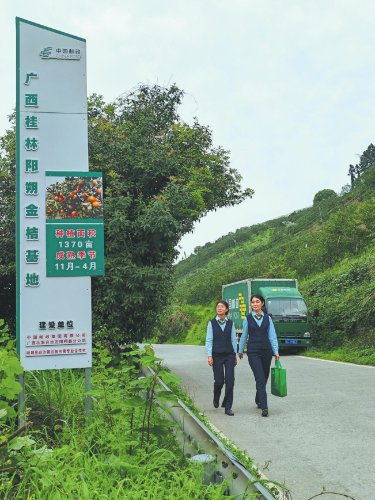 陽朔縣郵政分公司員工來到白沙鎮(zhèn)古板水果專業(yè)合作社,上門了解金桔生長情況。 □中國郵政報記者 呂文禮 攝