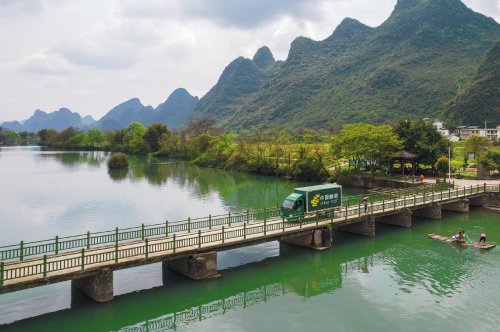 郵車行駛在桂林市陽朔縣遇龍河的大橋上?!踔苋A 攝