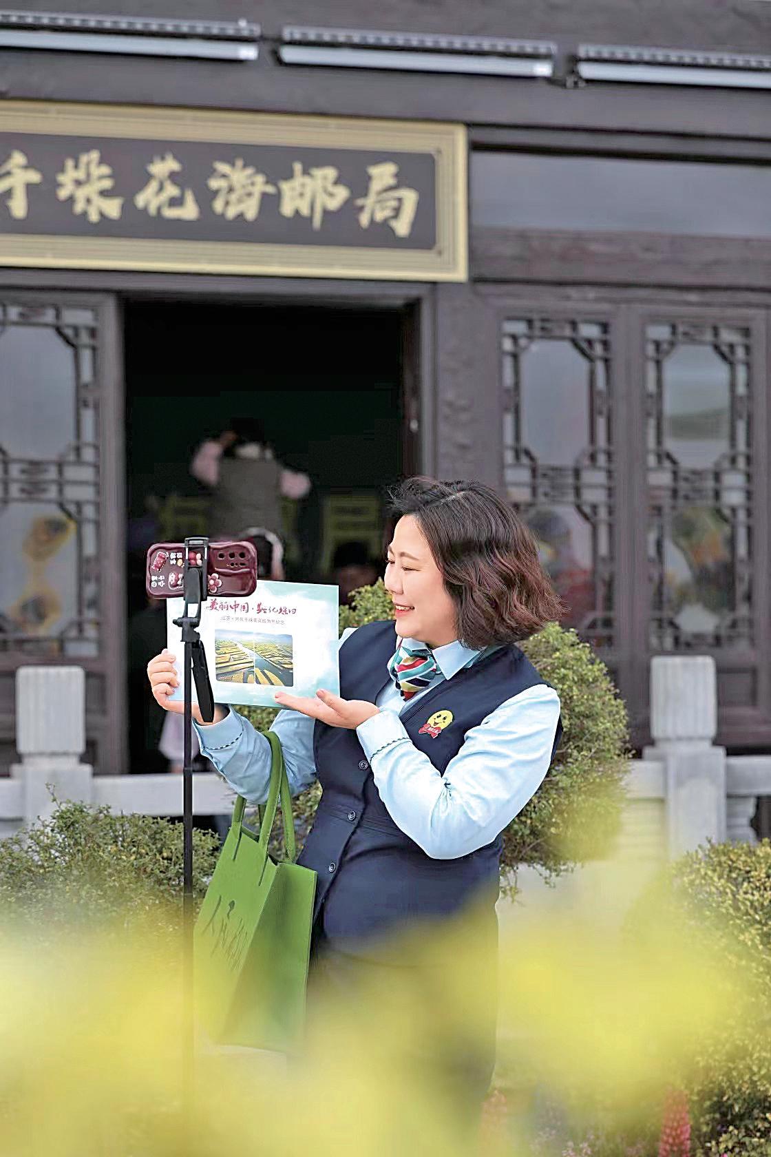 千垛花海郵局通過直播展示景區(qū)風光和傳播郵政文化。
