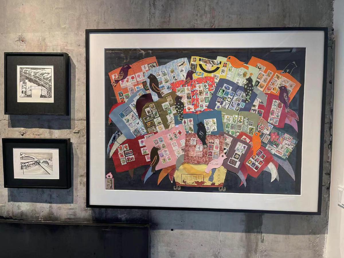 《繁花》郵折的大小與外觀,與小說的書封如出一轍。封面圖案飾以書中“春香家的婚房”,南面開門臨路的居住樣式,在過去的上海極有代表性;打開郵折,中央的《繁花》同名彩色插畫首先映入眼簾,接著一幅幅插畫又把小說情節(jié)回憶了一遍,吵吵鬧鬧的小人物——阿寶、陶陶、蓓蒂、汪小姐、李李,20世紀(jì)六七十年代的經(jīng)典場景——國泰電影院、小毛家、碼頭貓、曹楊工人新村、上海中心城區(qū)簡圖等一股腦兒涌現(xiàn)出來;郵票底部的背景圖選用了金宇澄為小說《繁花》創(chuàng)作的首張插畫《屋頂》——20世紀(jì)60年代的思南路,阿寶和蓓蒂并肩坐在屋頂,“瓦片溫?zé)?,黃浦江船鳴”。和小說一樣,金宇澄的畫作里充滿細節(jié)和敘事,透過精美的插畫郵折,能窺見《繁花》的煙火人間,對書中的萬事萬物展開想象,編織出“不響”背后的意蘊。