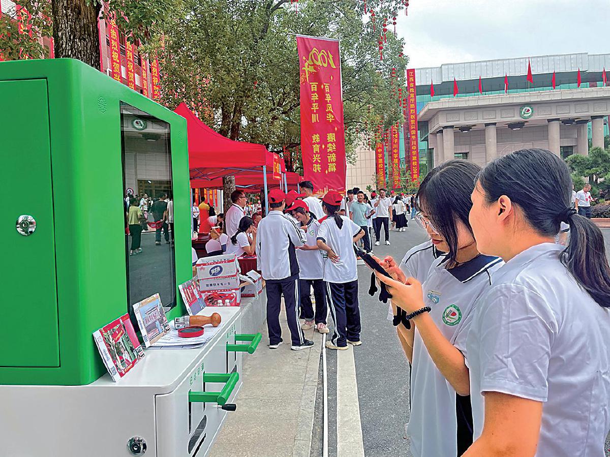 興國縣分公司在平川中學百年校慶活動現場設置明信片打印機,吸引同學們參與?! 趵钇G 攝