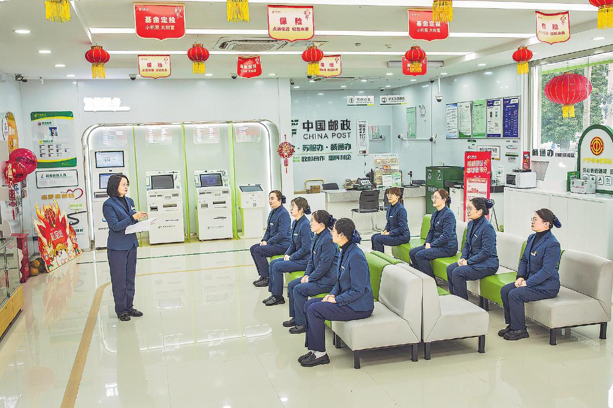 江蘇常州花園支局局長張小飛通過晨會鼓舞員工士氣、明確當(dāng)日工作任務(wù)?! 鯀敲簟z